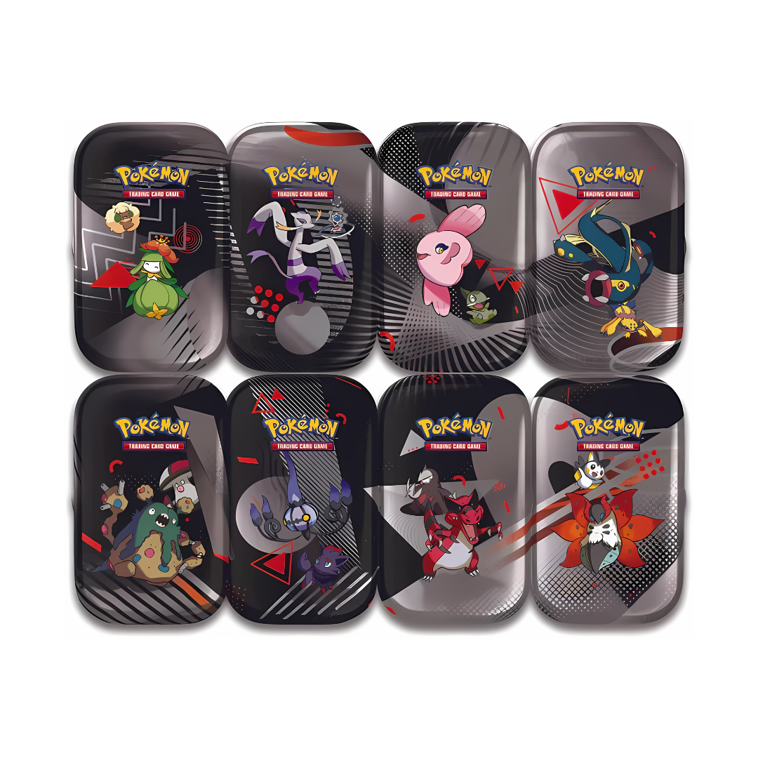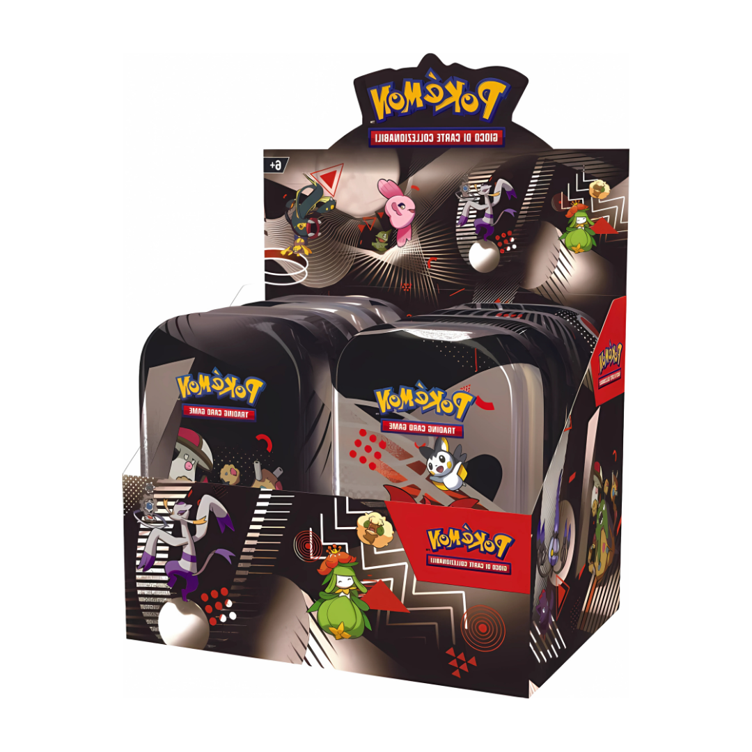 Colleziona tutte le varianti con il Case di mini tin da Collezione Luce Nera Fuoco Bianco, Questo set esclusivo contiene 8 Mini Tin con design unici dedicati alle espansioni Scarlatto & Violetto: Luce Nera e Fuoco Bianco. Ogni Mini Tin include 2 buste d’espansione (1 Luce Nera e 1 Fuoco Bianco) e una art card illustrata, perfetta da collezionare o esporre. Le Mini Tin, oltre a custodire le tue carte preferite, sono un accessorio compatto e resistente da portare sempre con te. Il case completo da 8 ti garantisce tutte le illustrazioni disponibili, rendendolo un must-have per i fan e collezionisti Pokémon.